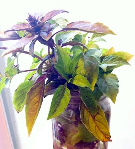 Next time I have scrambled eggs I can have fresh cut basil mixed in. The picture here is a  variety called purple leaf basil that taste just as good as the Italian Basil in my opinion and yet is a nice ornament in the kitchen. Italian basil will work just as well with this method.