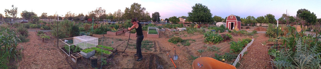 Just down the street from my work is a community garden made available by a partnership but the local county health and the UC Davis Master gardener program. This is a learning garden for master gardeners and for the community to grow their own food. For only $20/year you get a 16 x 16 foot plot with water and access to a tool shed with all your gardening needs. The whole area is behind a locked gate that is electrified to keep the rodents out.