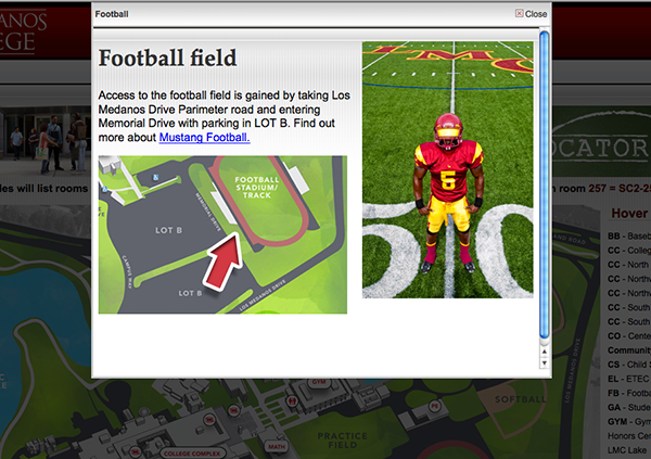 Then when you click on either the words or the building there is a window that dims the map and pops up with more information about the program and a closeup detail of the map. For this I used the greybox popup window script “that doesn’t suck”