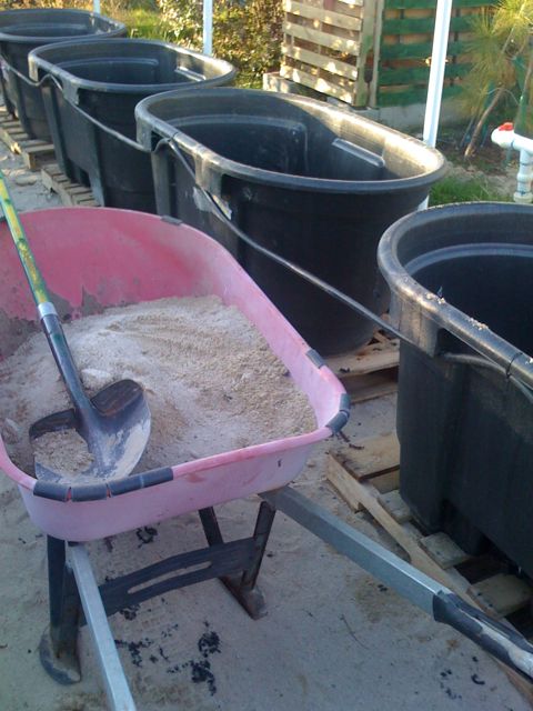 It seems the sand was not a good idea. The soil above it seems to have been a good choice but given the type of water we have  with the high mineral content it seems to bond with the sand and clogs up. Some of my bins stopped draining and were under water for days even after I turned the sprinklers off. I uprooted the plants and dug deep in the bins. When I got down to the layer of sand that nice white sand had turned to a smelly purple black color. When I redo these bins my plan now is to put a layer of weed cloth on the bottom as I did before to block insects from entering below and to stop contents from the inside falling out. The difference now will be a very thick layer of gravel and then another layer of weed cloth over the top of that and then the soil. My hope is this will produce a lot more air at the bottom allowing the soil to drain better and the second layer of weed cloth will prevent the soil from filling up the spaces between the gravel.
